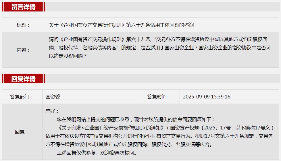 2025年9月国务院国资委网站政务咨询栏目部分网友提出的咨询,我们初步做出了认真的回应,现选择五条关注度高、点击量高的问题,再次推荐分享。