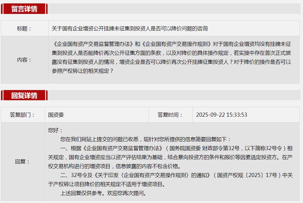 5、关于国有企业增资公开挂牌未征集到投资人是否可以降价问题的咨询
