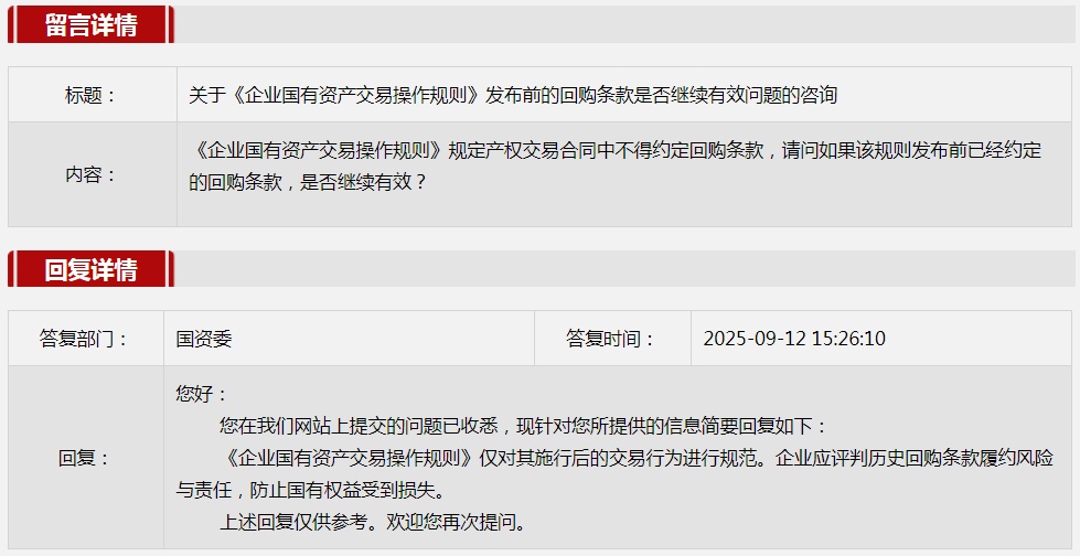 3、关于《企业国有资产交易操作规则》发布前的回购条款是否继续有效问题的咨询