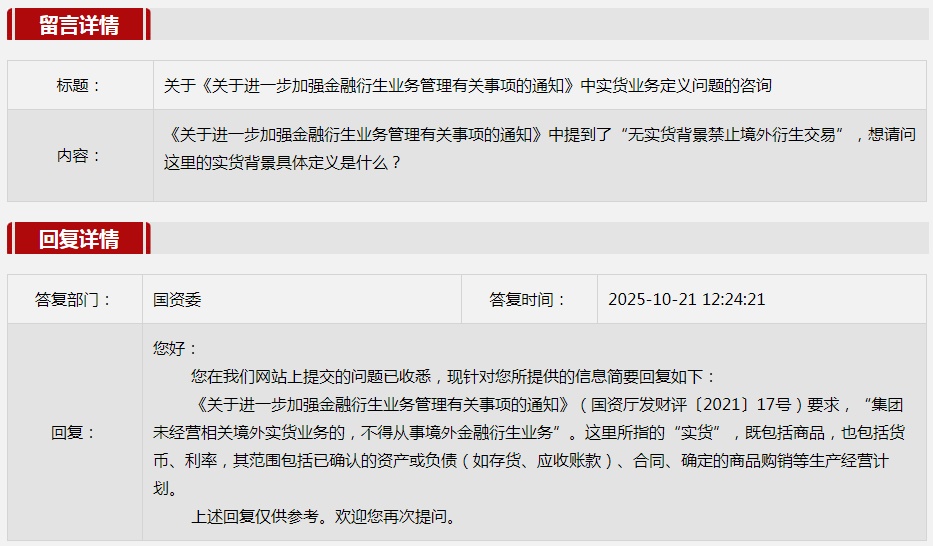3.关于《关于进一步加强金融衍生业务管理有关事项的通知》中实货业务定义问题的咨询
