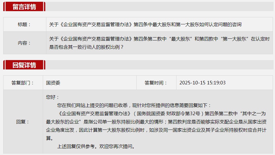 2.关于《企业国有资产交易监督管理办法》第四条中最大股东和第一大股东如何认定问题的咨询