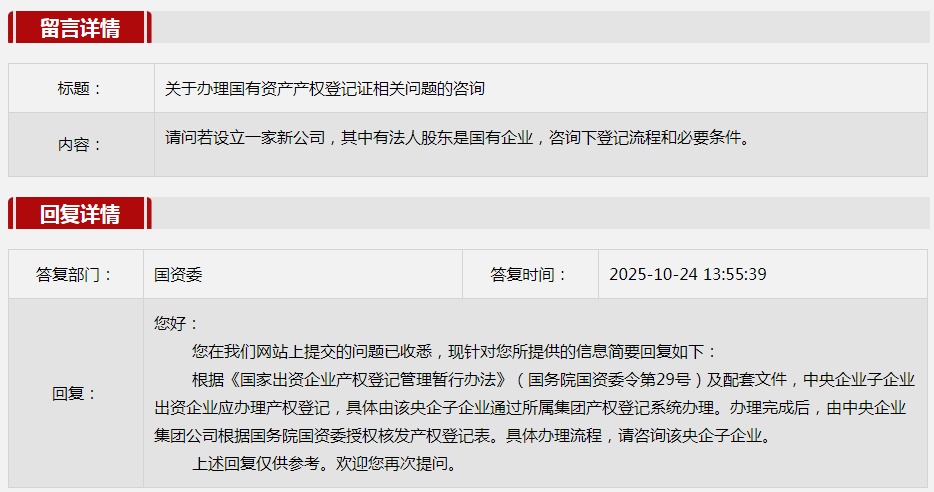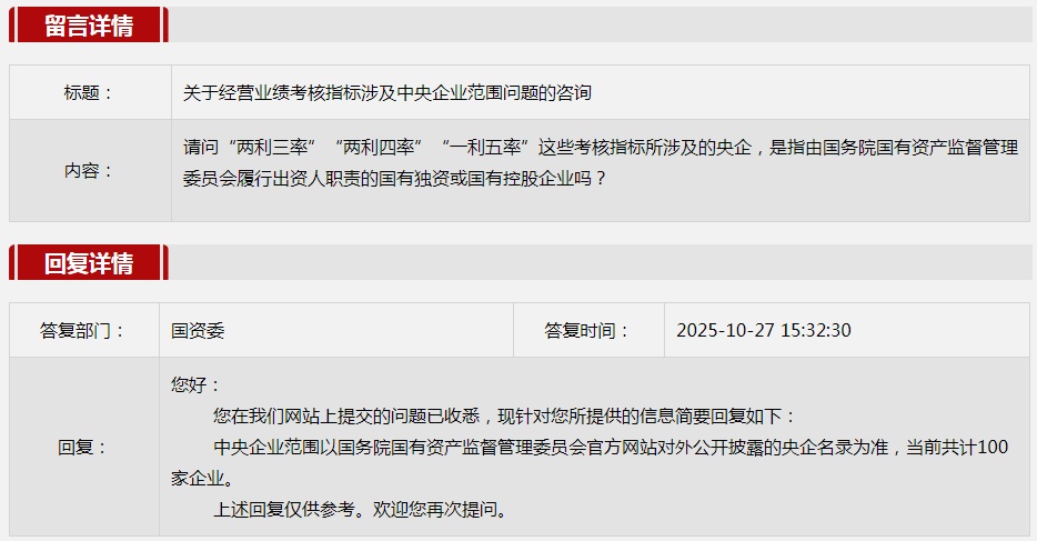 2025年10月国务院国资委网站政务咨询栏目部分网友提出的咨询,我们初步做出了认真的回应,现选择五条关注度高、点击量高的问题,再次推荐分享。