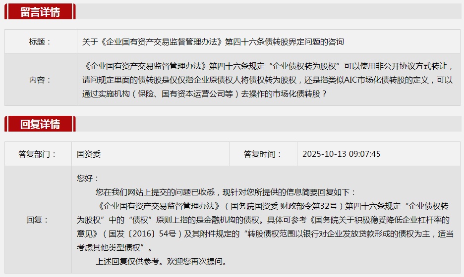 1.关于《企业国有资产交易监督管理办法》第四十六条债转股界定问题的咨询