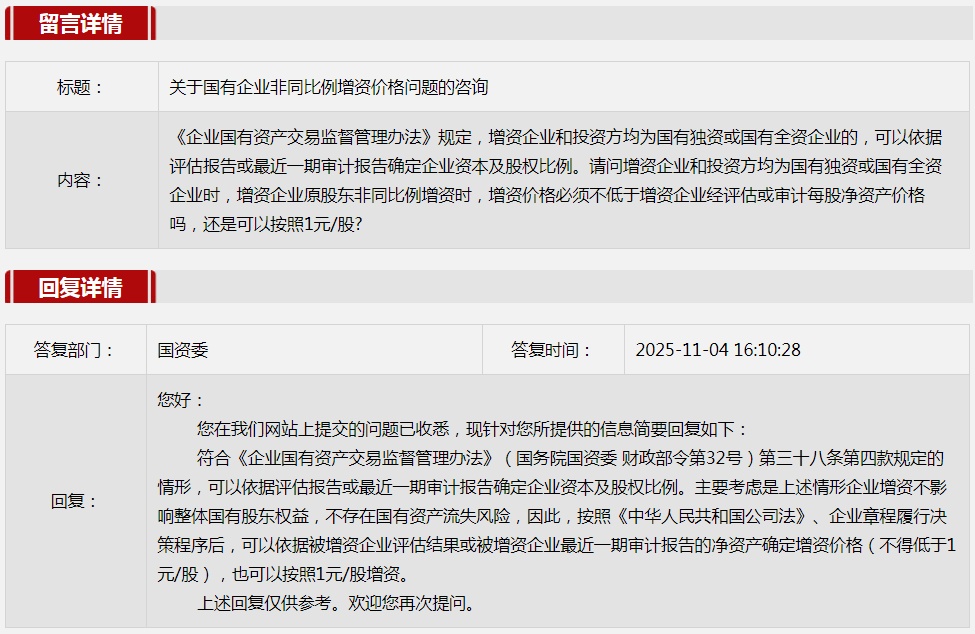 2.关于国有企业非同比例增资价格问题的咨询