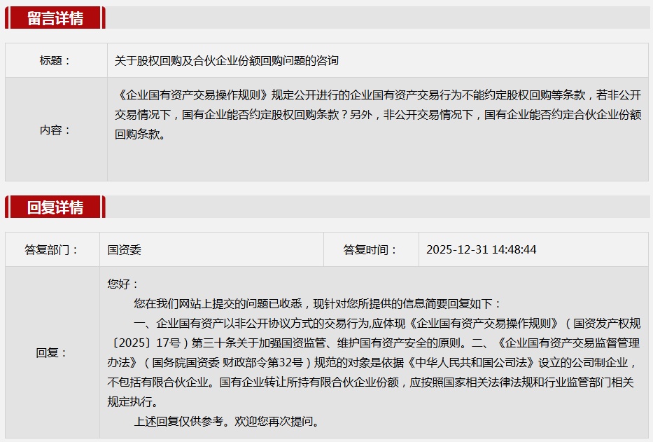 2025年12月国务院国资委网站政务咨询栏目部分网友提出的咨询,我们初步做出了认真的回应,现选择五条关注度高、点击量高的问题,再次推荐分享。
