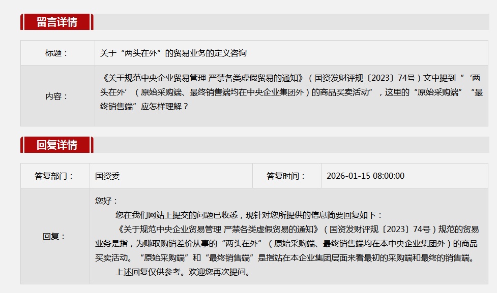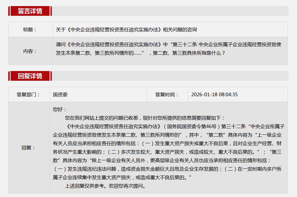 2026年1月国务院国资委网站政务咨询栏目部分网友提出的咨询,我们初步做出了认真的回应,现选择五条关注度高、点击量高的问题,再次推荐分享。