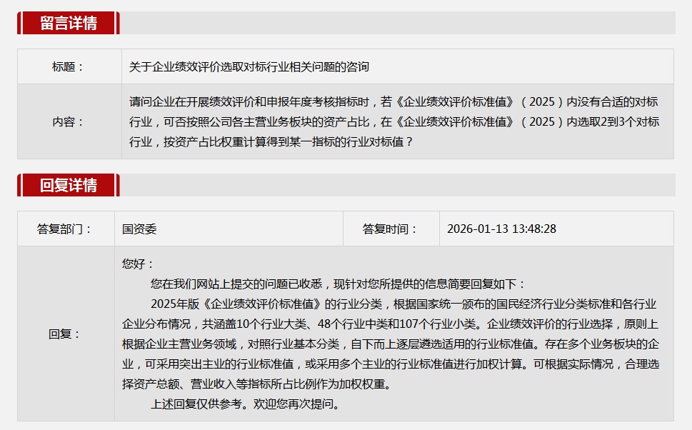 1.关于企业绩效评价选取对标行业相关问题的咨询